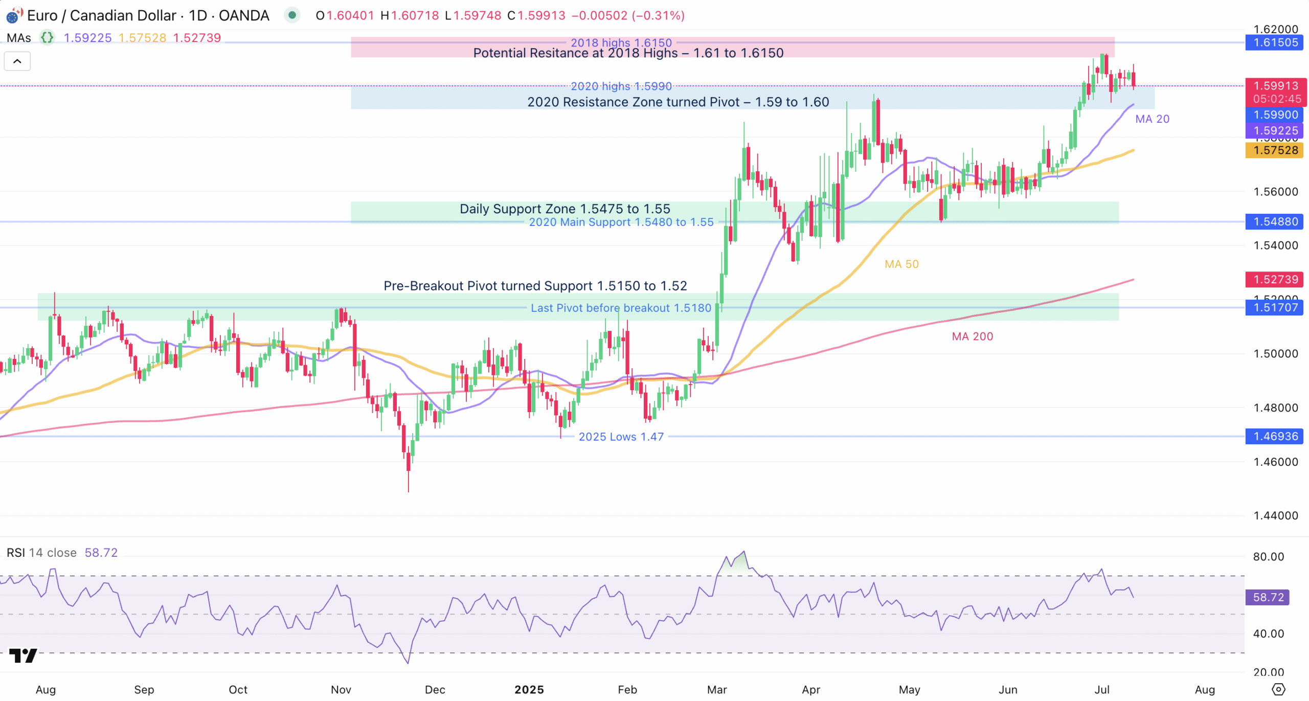 Delving into the EUR/CAD pair’s technical landscape, an examination from daily to hourly timescales paints a comprehensive picture. The currency pair has flirted with, but ultimately failed to overcome, the resistance zone around the 1.6150 mark, a threshold reminiscent of its 2018 highs. This inability to break through has been interpreted by market analysts as a potential signal for a broader reversal trend, complemented by the Relative Strength Index (RSI) indicating a convergence with price action to support this thesis.