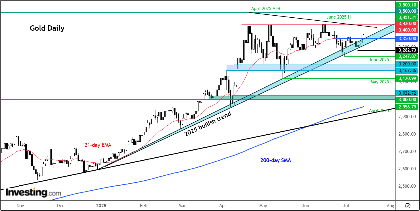 The forthcoming release of CPI and retail sales data will be pivotal in determining the dollar’s trajectory. So far, the inflationary impact of tariffs, spending plans, and upcoming tax cuts has not manifested in hard data. However, inflation may persist longer than markets anticipate, potentially delaying or limiting rate cuts. Should the retail sales figures for June indicate a rebound or if the CPI data signals higher inflation, this could propel the dollar and bond yields upwards, potentially creating a challenging environment for gold prices.