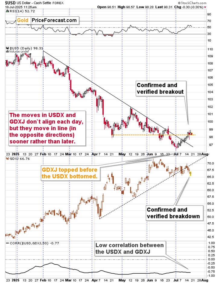 This sustenance of the USD above pivotal decline support lines, coupled with the VanEck Junior Gold Miners ETF (NYSE:) trailing below its rising support lines, only strengthens the anticipation of an upward USD Index trajectory and a downward movement for GDXJ values – a stance that has already been strong.