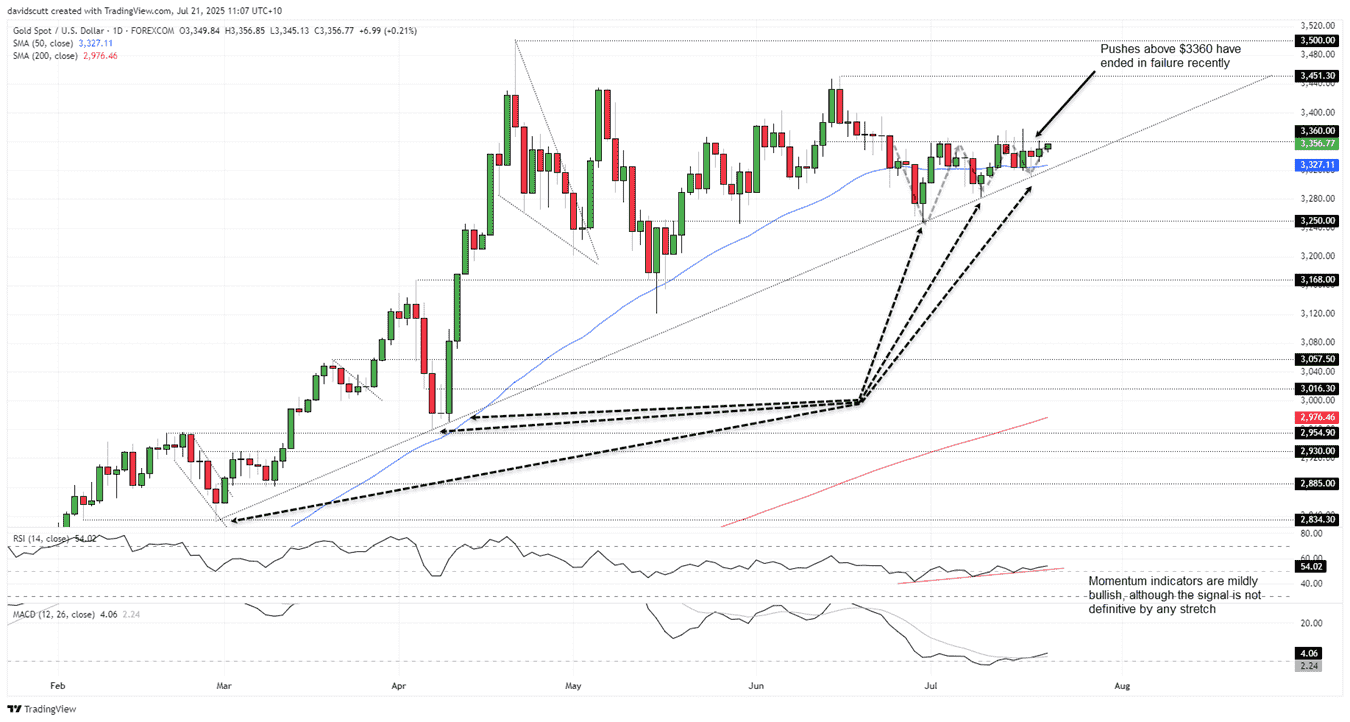 Should gold manage to decisively pierce and sustain above the $3360 resistance, it would set the stage for further upward movement. The immediate challenge in such a scenario would be crossing the July 16 high of $3377, following which the psychological thresholds of $3400 and the mid-June peak of $3451.30 would come into play. Surmounting these levels could pave the way for gold to retest its record highs, potentially reaching the $3500 mark.
