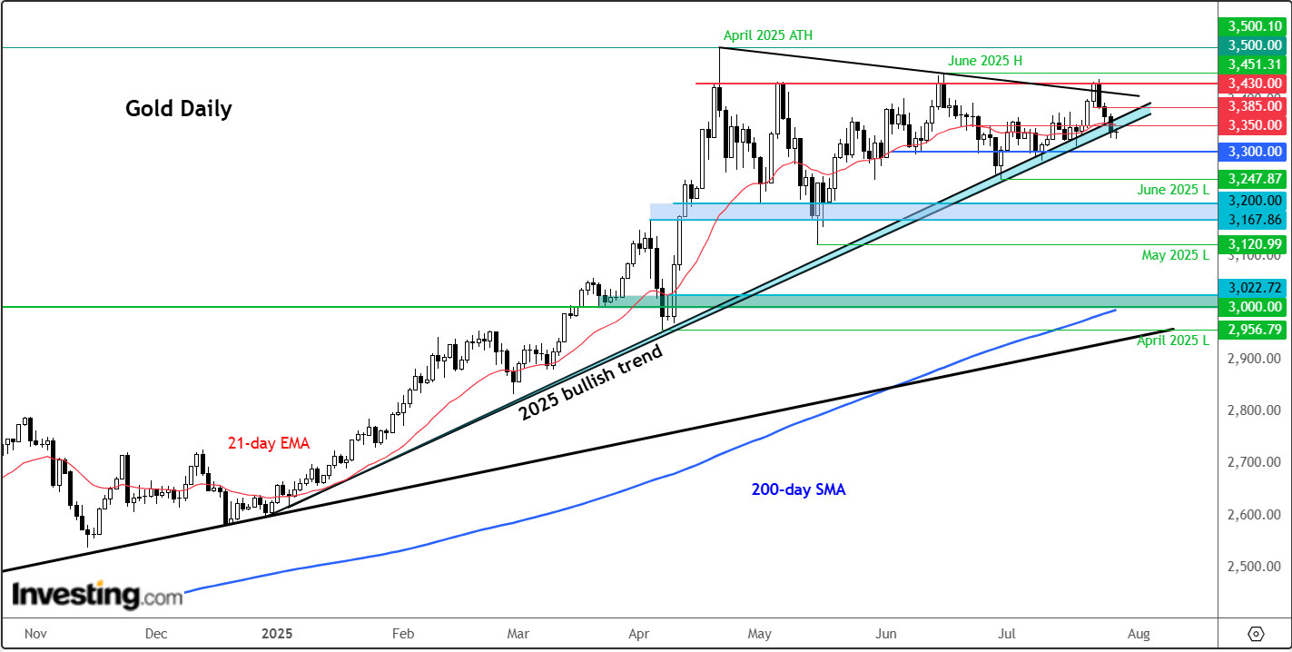 From a technical standpoint, gold’s trajectory retains an ostensibly positive outlook; however, the waning momentum is a source of unease for some investors. The precious metal is once again teetering on the edge of its 2025 bullish trend line, hovering around the $3,320-$3,330 bracket. A decisive breach of this trend line could catalyse market volatility.