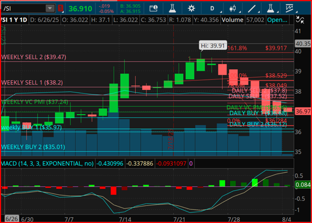 Following this apex, silver has embarked on what can be described as a controlled descent, adjusting to a price in the vicinity of $36.91. This movement situates the silver just a notch above the Daily VC PMI ($36.90), and intriguingly, on the cusp of a notable support range earmarked between $36.12 and $35.97. This range is not only pivotal due to its proximity to several critical analytical levels—Daily Buy 1 and 2, Weekly Buy 1, and a 360° Square of 9 downward rotation from the peak price—but it also coincides with an anticipated Gann Time Cycle window, identified between August 5th and 7th. This window, calculated 13 to 15 days following the July 18th pivot low, inherently suggests a potential point of trend fatigue, inviting a reversal in the prevailing directional momentum.