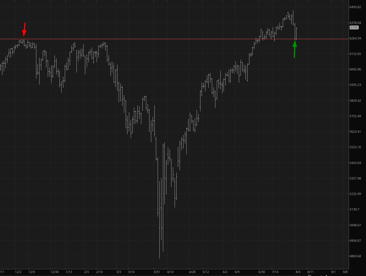Months prior, I had marked a noteworthy point on the chart of the S&P Futures (ES), identifying a line which anchored to a previous all-time high (signified with a red arrow in the analysis). On the particularly volatile Friday in question, the ES approached this line at the peak of the downturn, almost as if drawn by a magnetic force, before rebounding sharply (highlighted with a green arrow). Remarkably, this reversal was so potent it almost entirely erased the losses of the day.