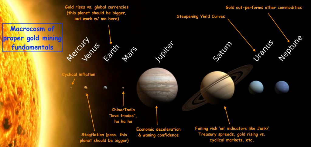 In the boundless realm of finance, where markets and investments ebb and flow with the unpredictability of a stormy sea, there exists a concept so vast and intricate that it mirrors the grandeur of the cosmos itself. This concept, which I have chosen to term the “Macrocosm,” serves as a metaphorical planetary system which seeks to simplify and represent the myriad factors influencing the gold mining sector and its foundational role within the broader macroeconomic landscape. The larger a planet within this celestial analogy, the greater its positive relevance to the underpinnings of gold mining and its macro fundamentals.