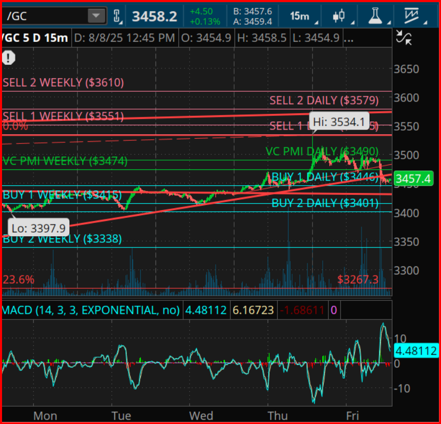 By Thursday, the scene had transformed dramatically; gold had not only reclaimed the VC PMI Weekly pivot at $3,474 but had also surged past the Sell 1 Daily mark of $3,530, coming into brief contention near the Sell 2 Daily threshold at $3,579. Through these developments, the market seemed to be pausing, consolidating its gains and plotting the next course between the realms of Buy 1 Daily at $3,446 and the VC PMI Daily pivot at $3,490—a classic precondition for the impending decision on direction.