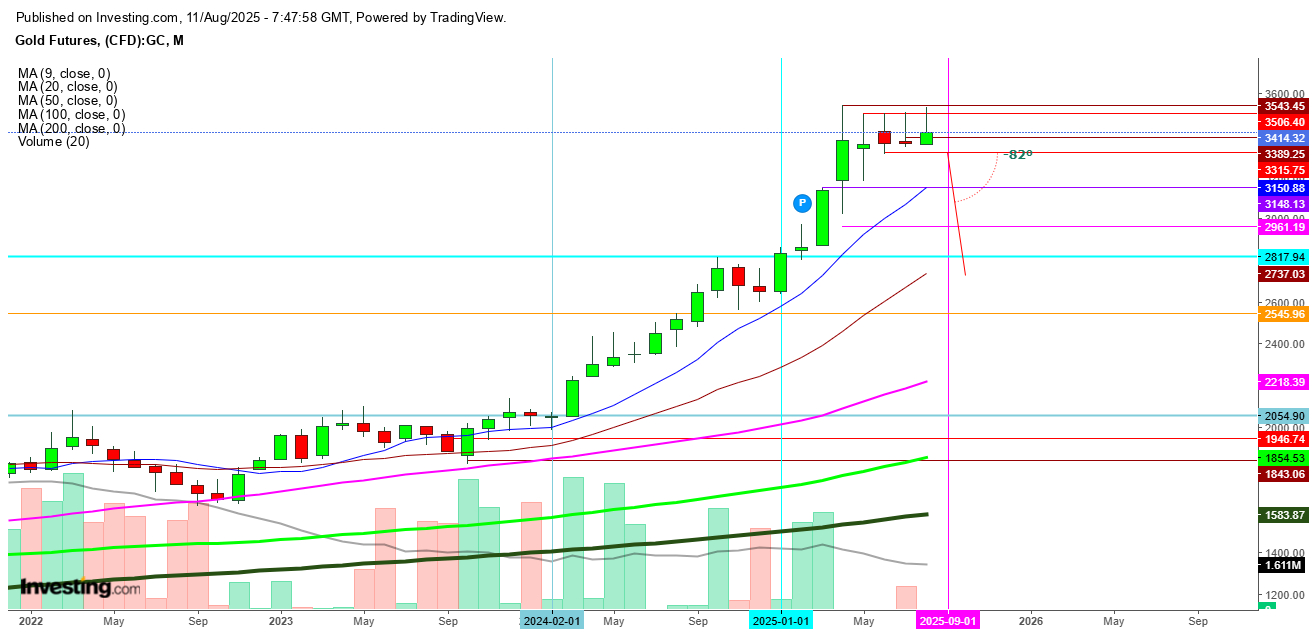 On a daily analysis, following a peak at $3,536 last Friday, gold futures plunged, culminating in an ambiguous candlestick pattern. This pattern underscored the day’s tight trading range despite the highs and lows, setting a precarious stage for Monday. Already, with gold futures dipping below the significant $3,444 support level, the gaze now shifts towards the forthcoming support at the 20-day moving average of $3,406. A decisive break below this could spiral downwards to the 50-day moving average at $3,378, and failing to hold this front could further test the resilience at the 100-day moving average at $3,312. Failing this, the path may clear for a plunge towards an initial target of $3,210 before August 28, 2025.