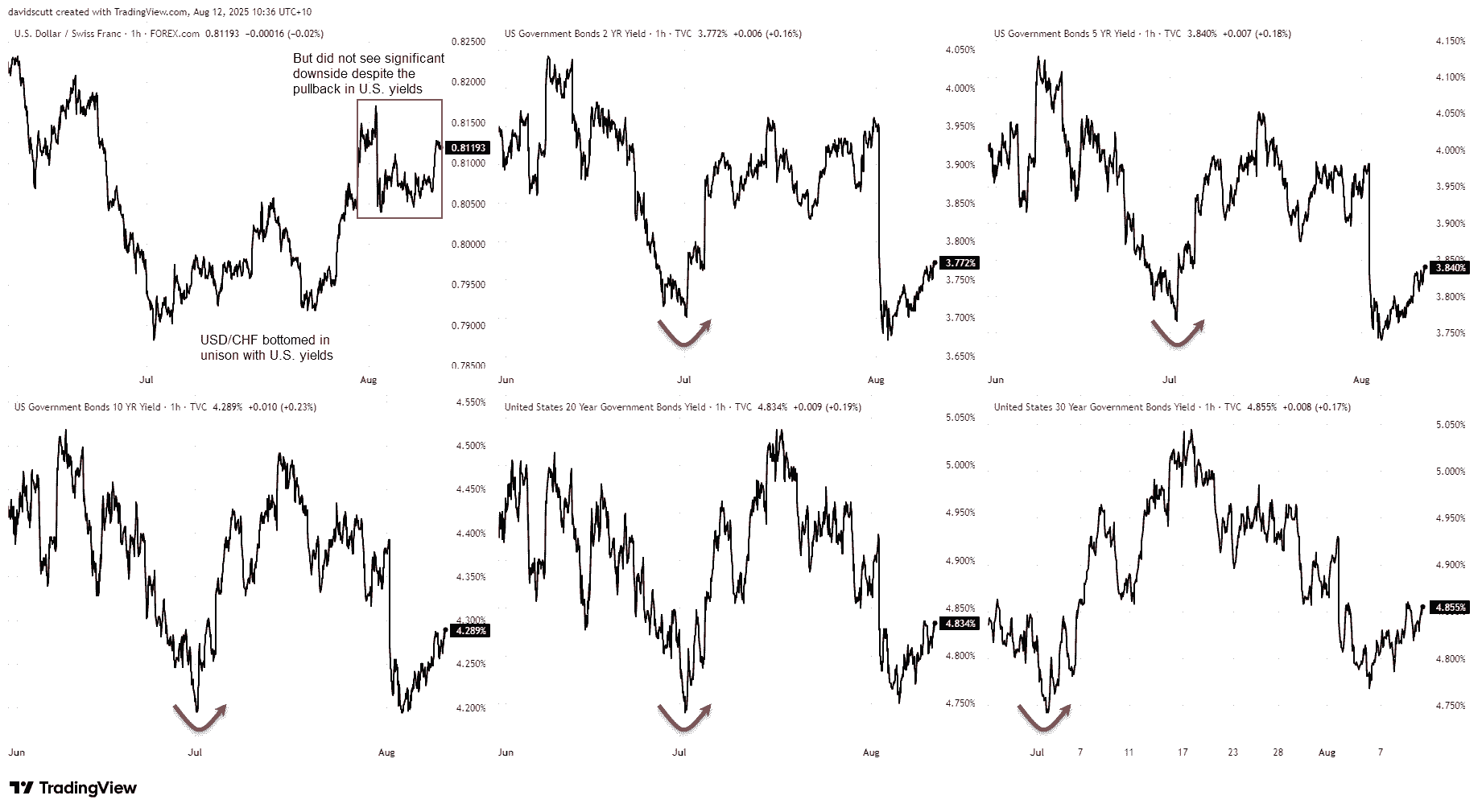 The Swiss Franc’s recent phase of underperformance is rather unusual, considering its longstanding reputation as a fortress of stability. The currency started to falter in early July, a trend exacerbated by a confluence of factors including higher U.S. Treasury yields and a less volatile geopolitical climate. Additionally, fears regarding the worst possible outcomes of U.S. tariff policy have subsided, further diminishing the Franc’s appeal as a safe haven.