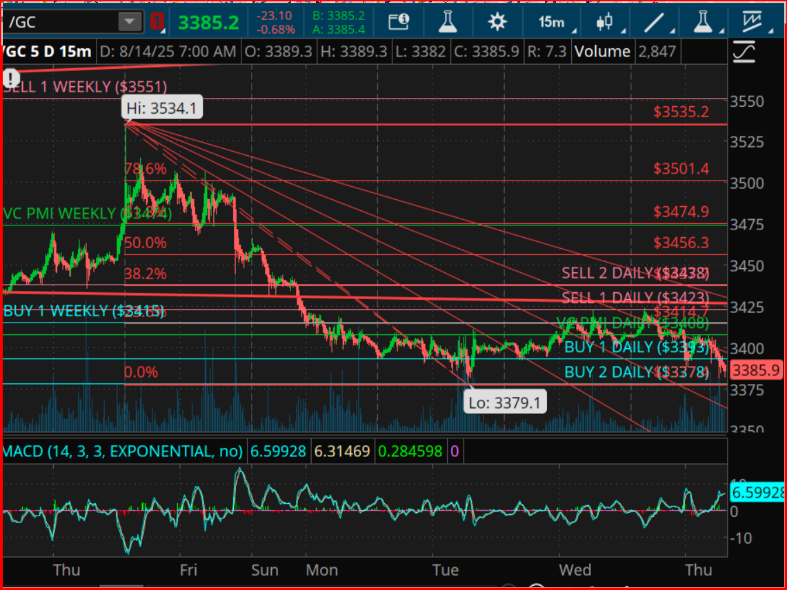 Further depth is added to this analysis through the application of Square of 9 principles, another technique attributed to Gann. By anchoring at the $3,379 low, projections can be made for potential upward targets at $3,423, $3,456, $3,501, and $3,551. Remarkably, these projections correspond closely with VC PMI Sell 1 levels, Fibonacci retracement points, and weekly resistance territories, underscoring their relevance as checkpoints for any emerging upward market movement.